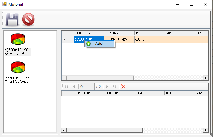 如果当前工序需要进行物料消耗,Material按钮自动变成可用状态,在下图左边显示当前工序BOM中需要消耗物料,右边上半部分显示工单配料,右击点Add,在新窗口输入投入数量和报废数量