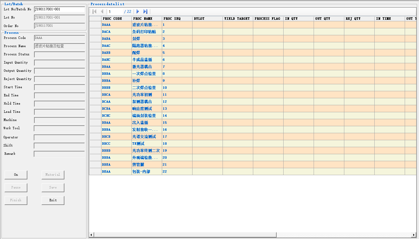 扫描Lot或Batch,左边显示当前工序详细信息以及右边网格显示完整工艺流程信息